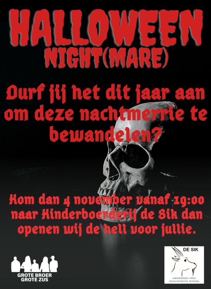 Op 4 november opent zich ‘de hell’ bij Kinderboerderij De Sik, Halloween skull pop culture brandt dan los. GroteBroer/GroteZus heeft er een aandeel in dus dat het eng wordt, dat is gegarandeerd.