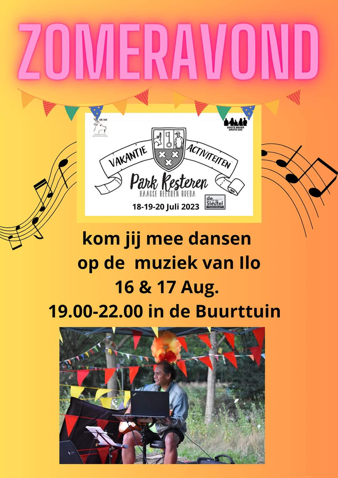 Zoals voorgaande jaren zullen op 16, 17 en 24 augustus door de vrijwilligers van Ontmoetingscentrum De Sleutel, kinderboerderij De Sik en Grote Broer en Grote Zus gezellige Zomeravonden met livemuziek worden georganiseerd in de Buurttuin bij Ontmoetingscentrum De Sleutel. Buurtbewoners kunnen dan genietend van een drankje van 19.00 - 22.00 uur naar de muziek luisteren of een dansje wagen.